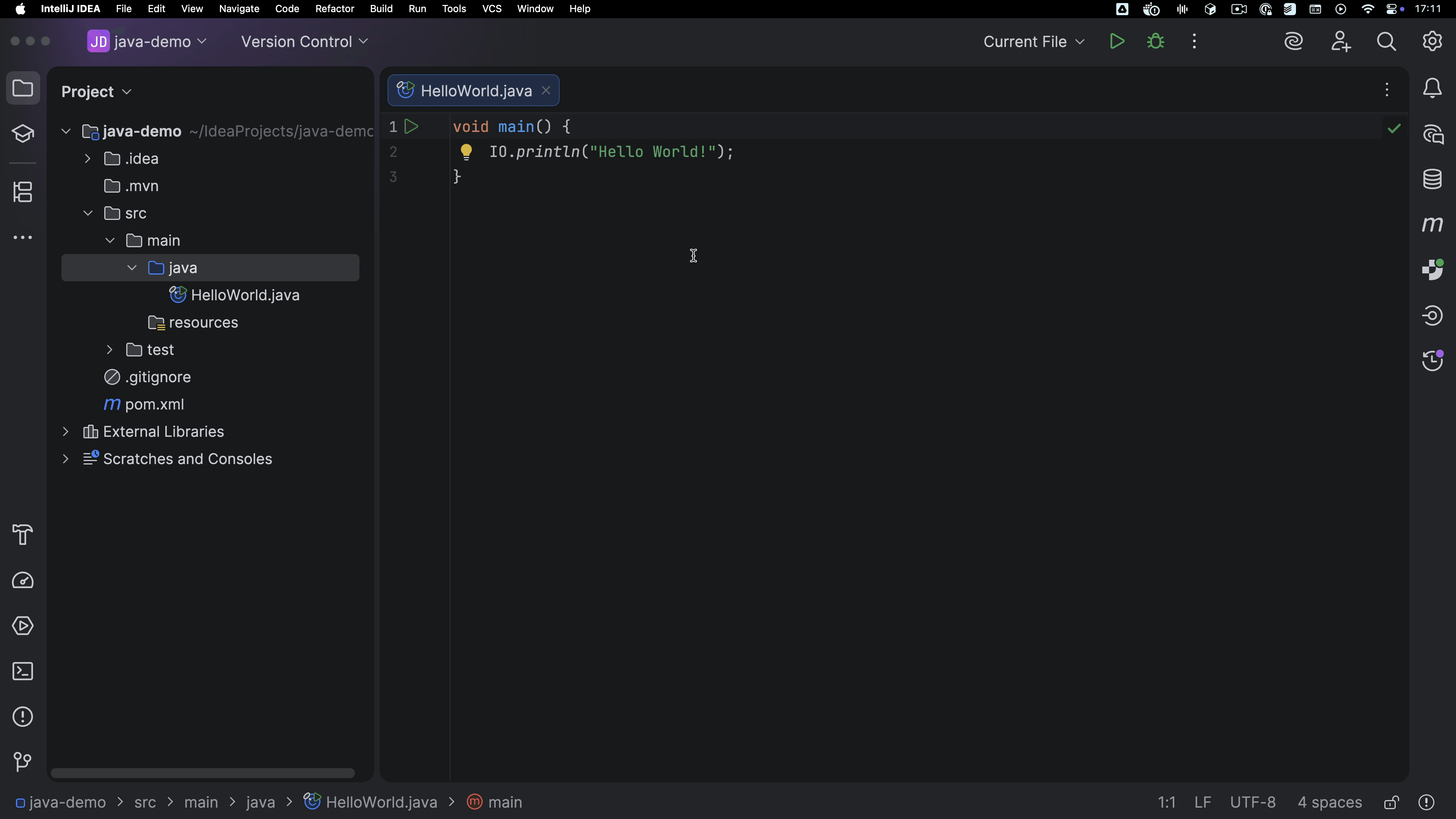 To keep things simple, let's make the program print Hello World! to the console and move the cursor to a new line, by adding IO.println("Hello World!"); to the method body: