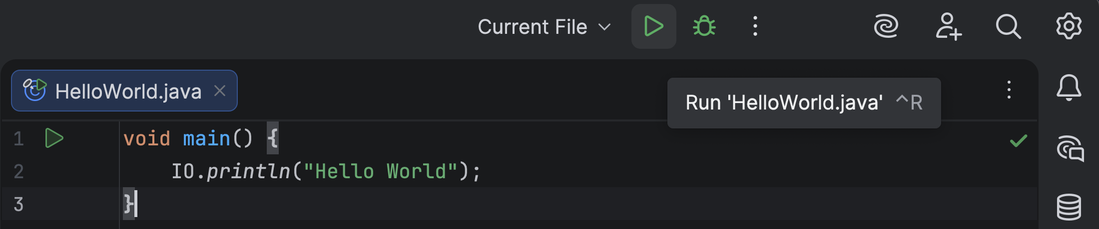 If you have a compact source file, you can run your HelloWorld application directly from the editor, by clicking the green Run button in the gutter near the main method declaration, or by using the shortcut ⌃⇧R (on macOS) or Ctrl+Shift+F10 (on Windows/Linux).