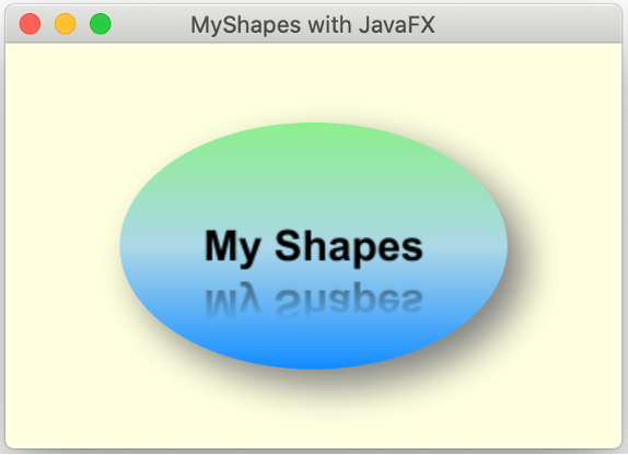 You can observe below the enhanced MyShapes program running in a window. You see the linear gradient fill applied to the ellipse, a drop shadow on the ellipse, and the reflection effect applied to the text.