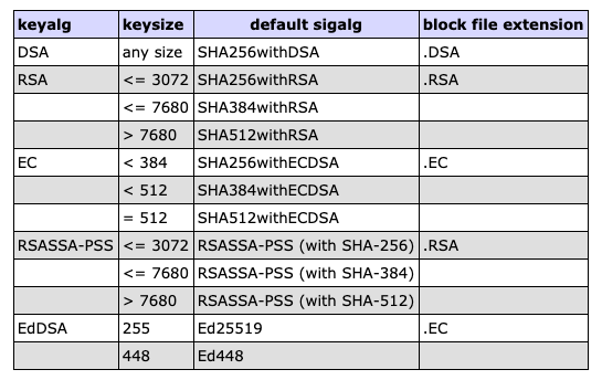 By default, the jarsigner command signs a JAR file using one of the following algorithms and block file extensions depending on the type and size of the private key: