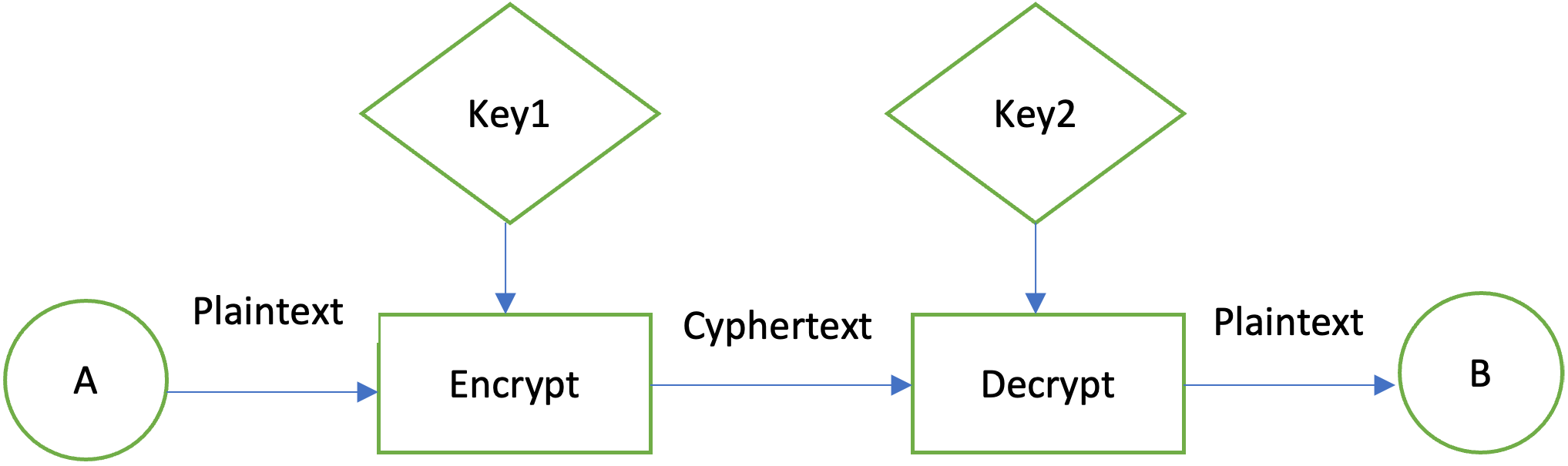 Asymmetrical encryption uses a pair of mathematical related keys, one for encryption and the other for decryption. In the example bellow Key1 is used for encryption and Key2 is used for decryption.