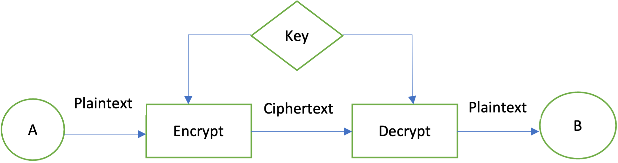 Symmetric or shared key encryption is a method where both parties share a key, kept secret by both parties. For example, sender A can encrypt a message with a shared key, then receiver B can decrypt the encrypted message only with that key.